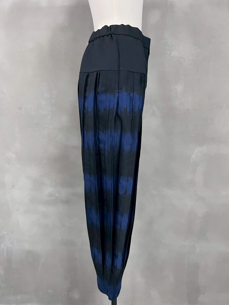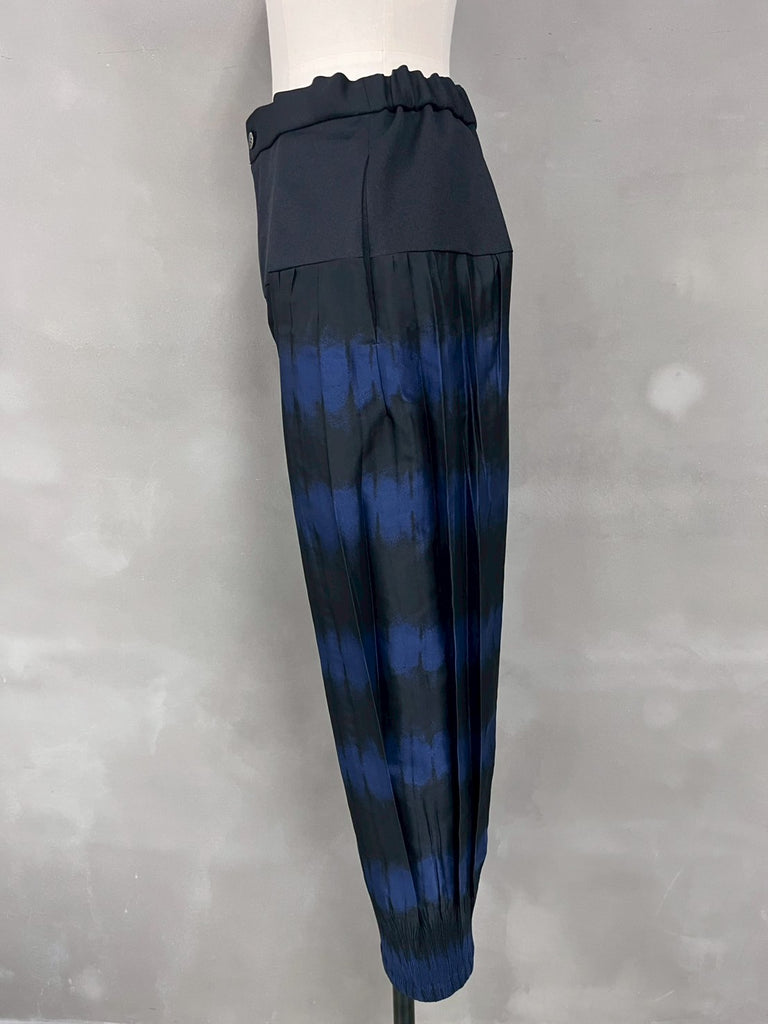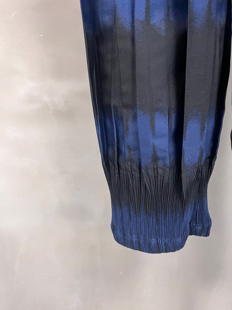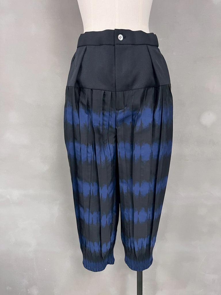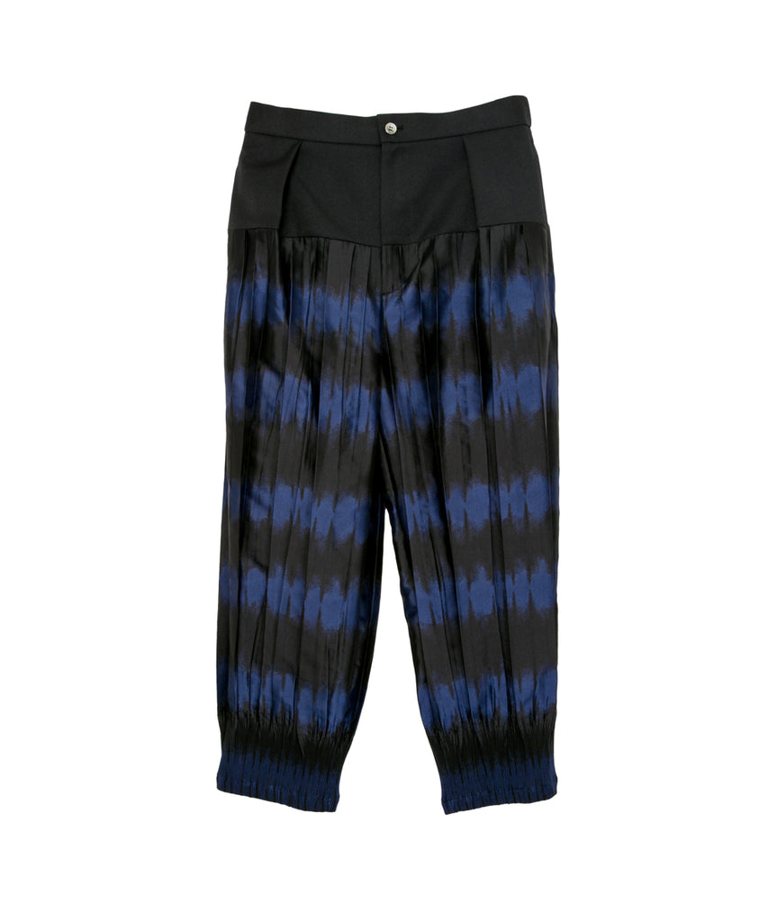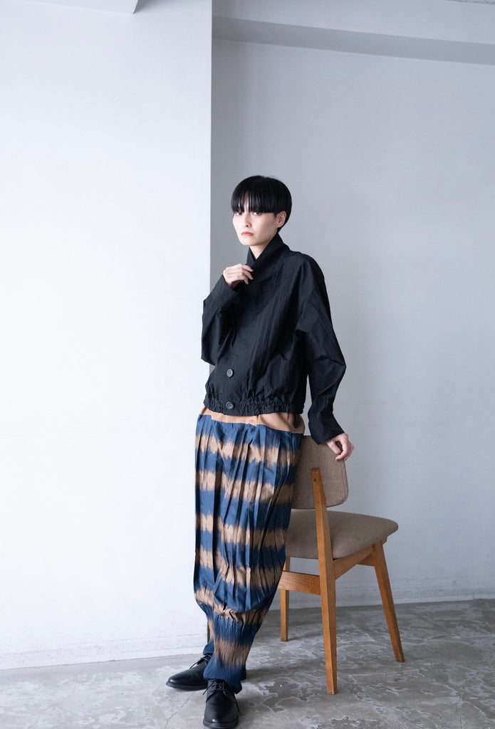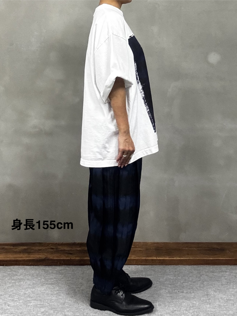 ジャガード織の凹凸感がある素材に、裾はシャリーング加工を施したテーパードパンツ。サイズによって丈のみを変更しています。ウエスト部分は中の紐で調整可能です。腰回りや太ももはゆったりとしたデザインで、膝から下にかけスッキリとしたデザインはスタイルUPにも効果的です。