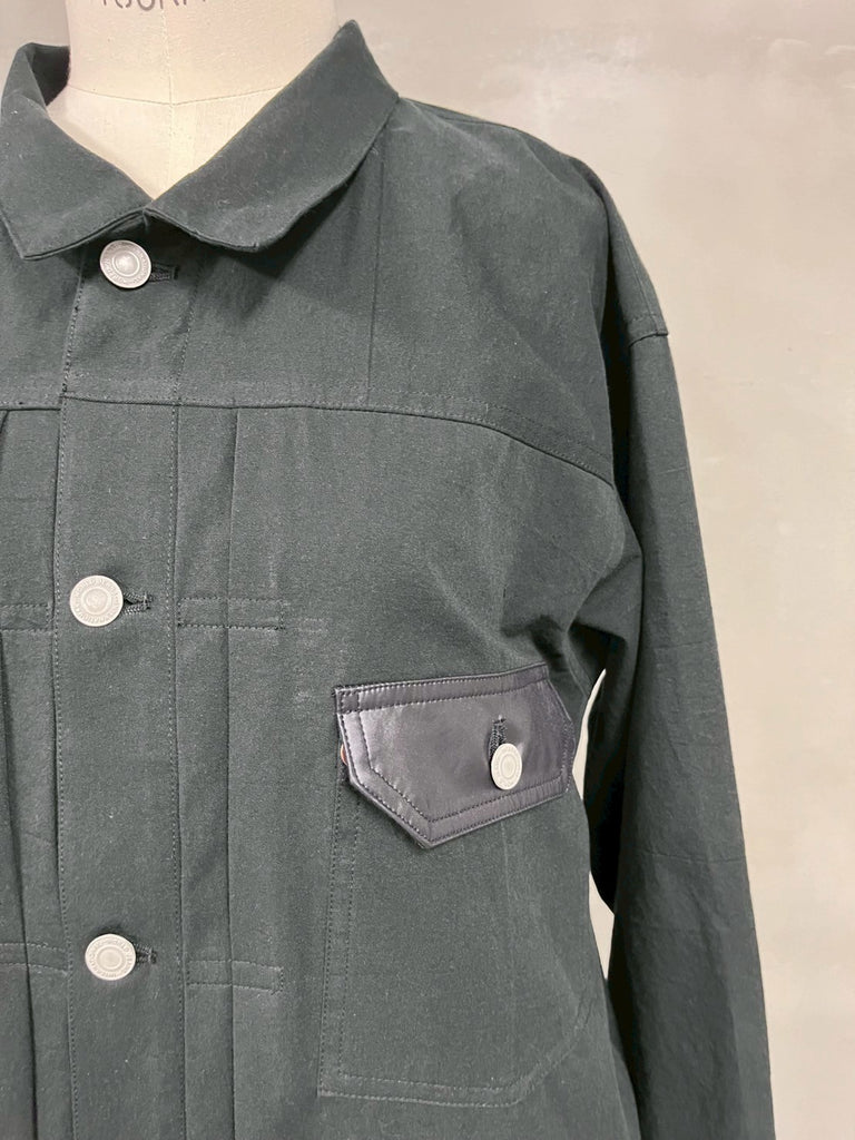 ゆったり目にデザインされたGジャン。東炊きという、昔ながらの手法で仕上げた素材を使用しており機械では出せない自然な膨らみやナチュラルな発色が特徴で、柔らかい着心地が魅力的な1着です。胸ポケットのフラップを異素材で切り替えたデザインがポイント!春先にTシャツの上にサラッと羽織っていただけます。N0426S0004ABとのセットアップもおすすめです。