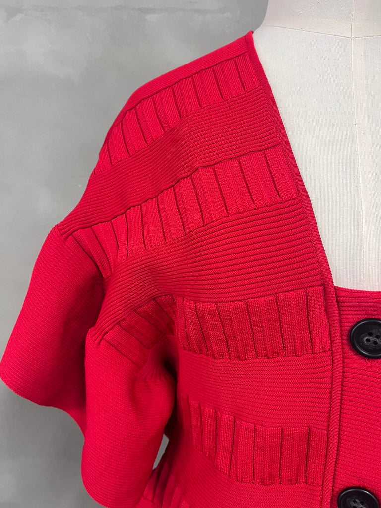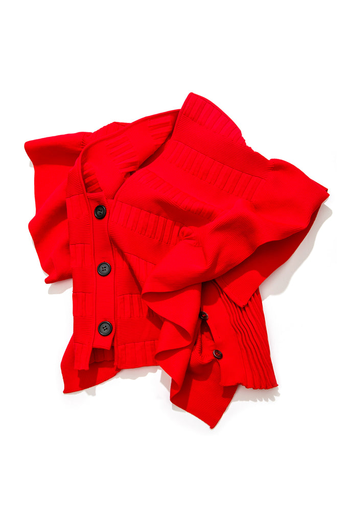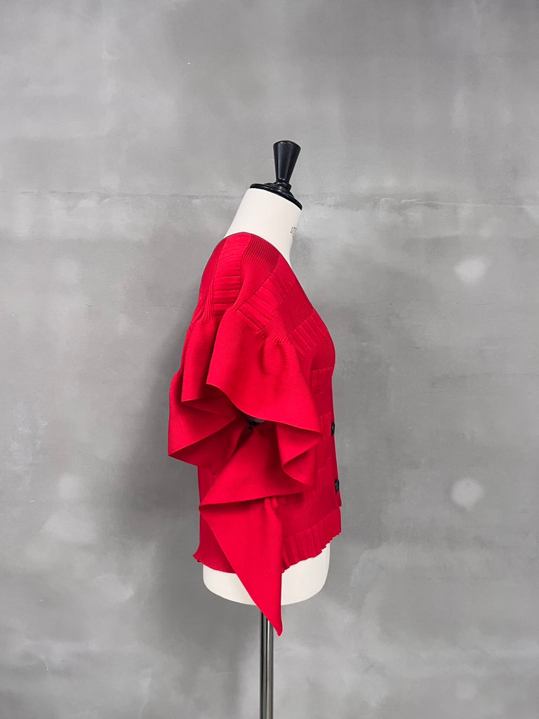 袖周りのフリルが特徴的なニットカーディガン。