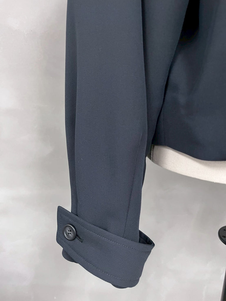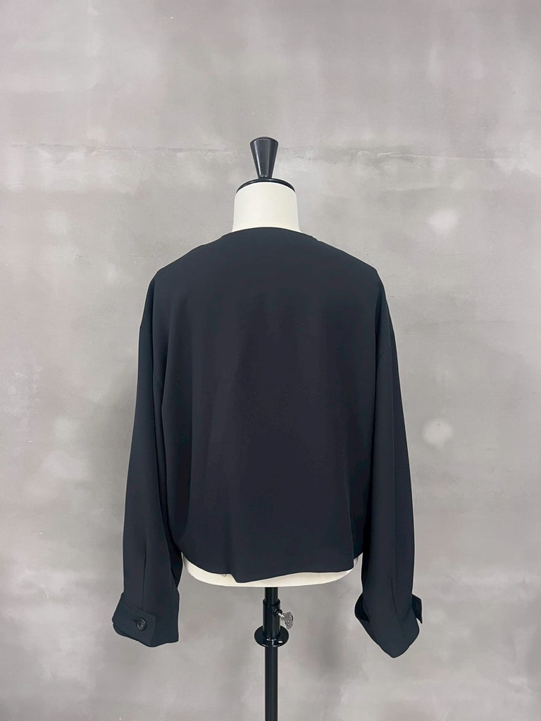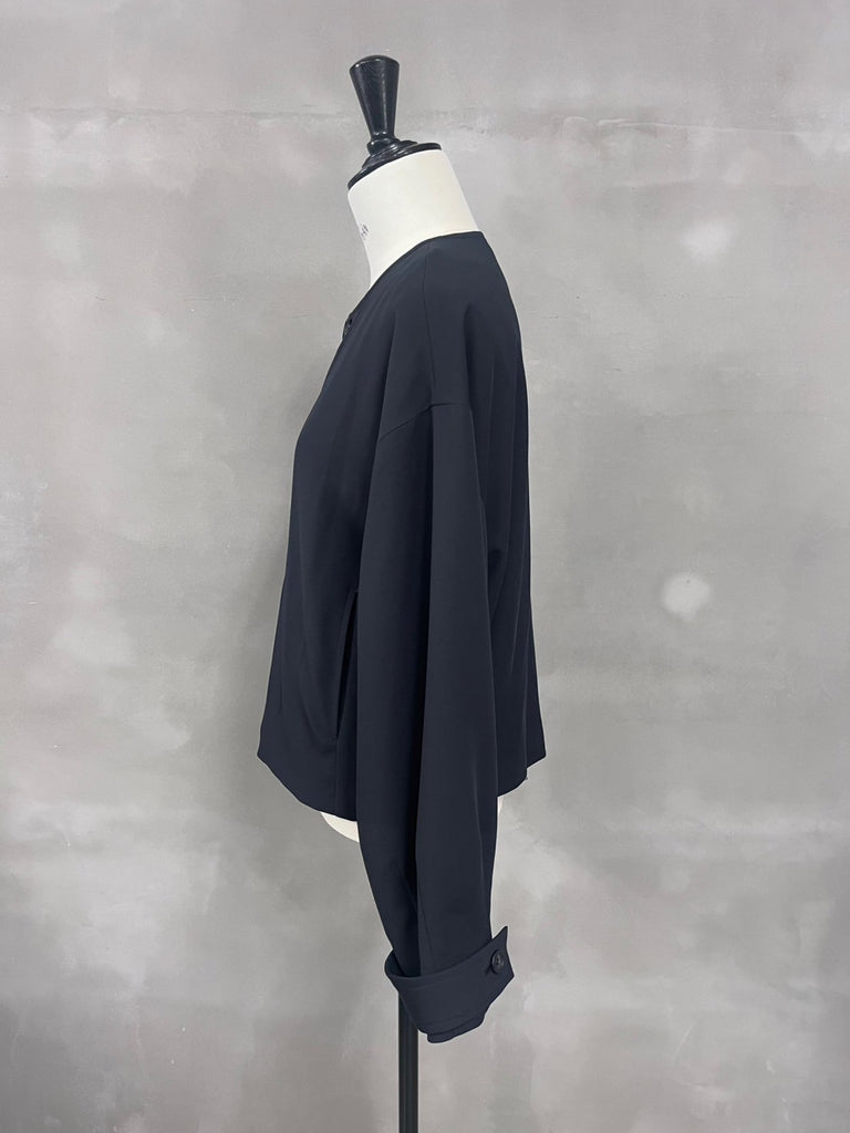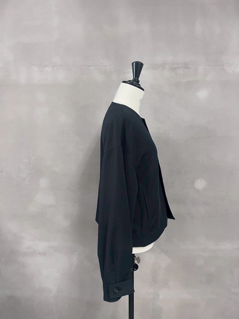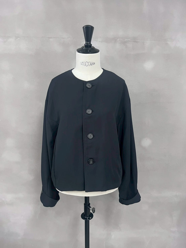 袖にボリューム感を持たせたノーカラーショートジャケット。