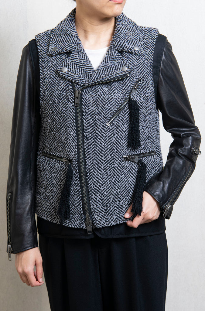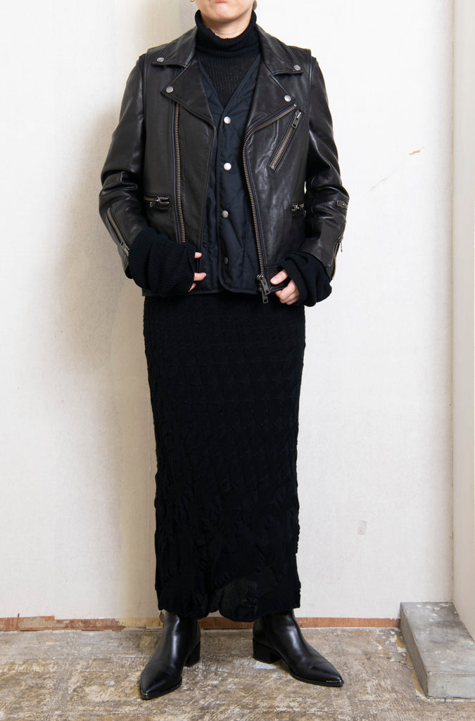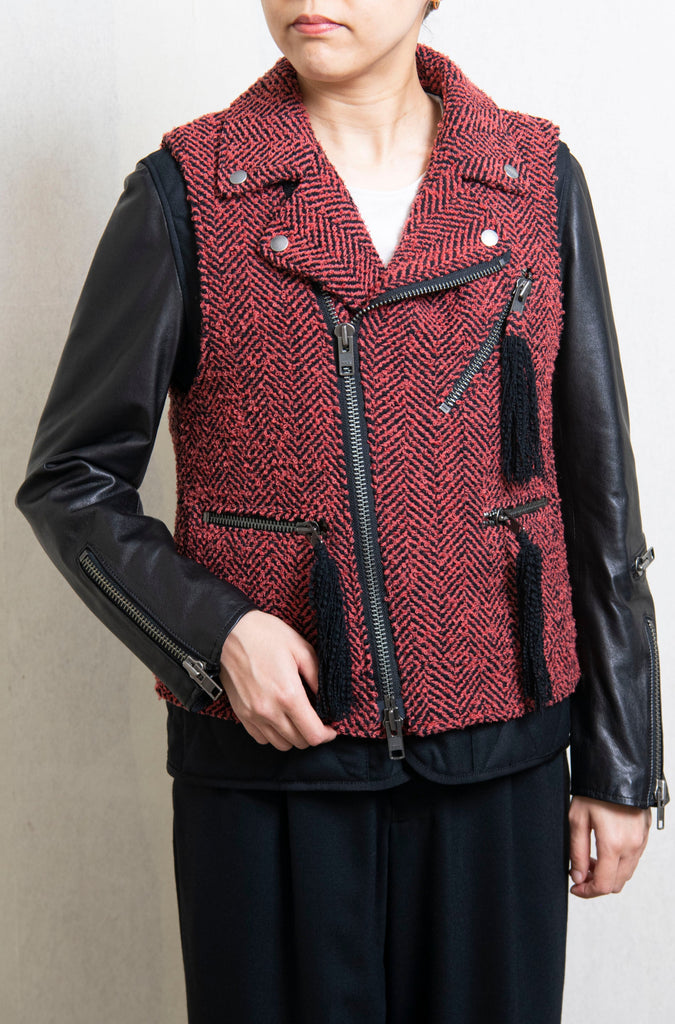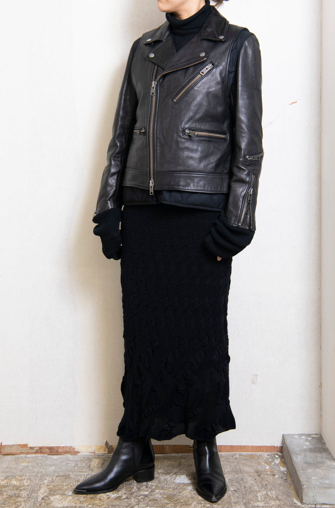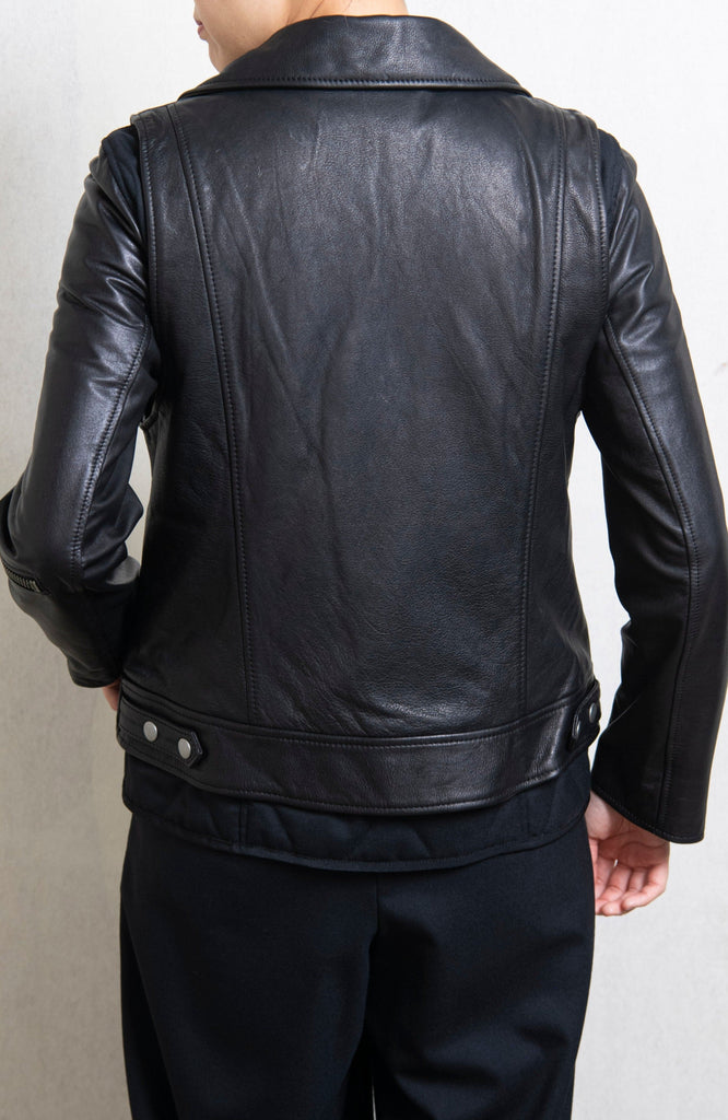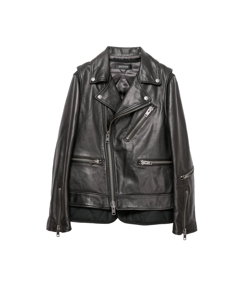 レザーのベストN0621A0023/レザーライダースベスト(cow leather)とレイヤードしてご着用頂き、一枚のレザージャケットのように見えます首元はVネックで、ベストを重ねても見えないような深さですが、一枚で着た時には開きが深すぎず、スッキリとした印象に仕上げてくれるデザインとなっております。